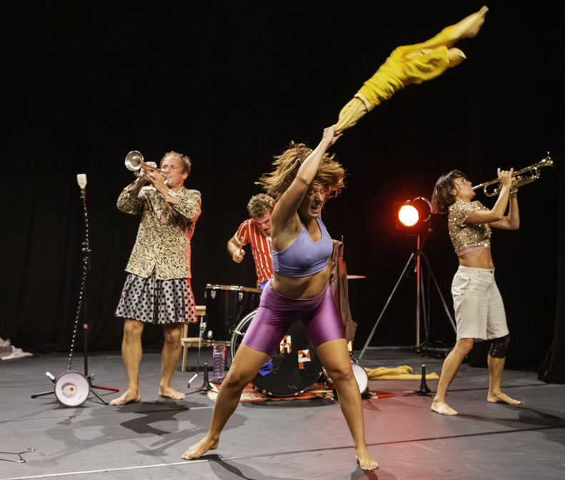 Opéra Punk, ce sont 4 interprètes incarnant des danseurs, des musiciennes, des chiens, des amoureuses, les vagues de la mer… passant de l’un à l’autre comme on se transforme lorsqu’on traverse les rideaux d’un théâtre pour entrer sur scène. Nous sommes à la fois dans les coulisses et en train d’assister au spectacle. Dans cette comédie musicale, la musique est acoustique, les sonorités passent de mélodies romantiques à des chansons punk poignardantes.