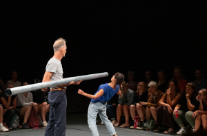 Durant le spectacle, cela oscille entre travail de plombier et labeur de sculpteur de plein air, entre artisan et artiste, entre travail manuel utilitaire et création fantasque. Entre celui qui construit le pratique et celle qui joue à l’imaginaire : un tuyau longue vue, un tuyau instrument à vent. Le jeu scénique ne cessera de passer d’une conception à l’autre.