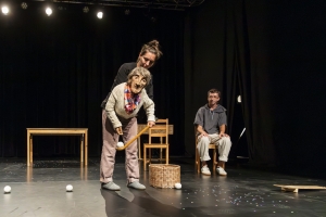 Durant le spectacle, cela oscille entre travail de plombier et labeur de sculpteur de plein air, entre artisan et artiste, entre travail manuel utilitaire et création fantasque. Entre celui qui construit le pratique et celle qui joue à l’imaginaire : un tuyau longue vue, un tuyau instrument à vent. Le jeu scénique ne cessera de passer d’une conception à l’autre.